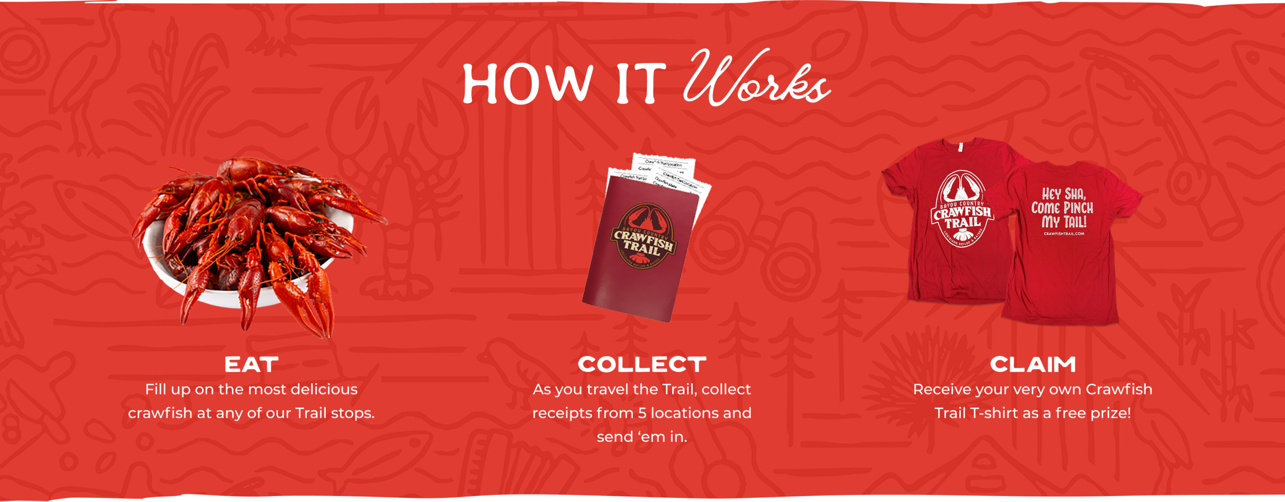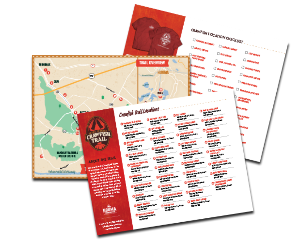 Ready to hit the Trail? We’ve packaged up everything you’ll need. Our downloadable Trail Guide includes a map and listings of all Trail locations, as well as a print-at-home tracker for checking off all the delicious places you visit. Be sure to save your receipts — once you’ve collected 5, redeem them to claim your very own Crawfish Trail T-shirt!